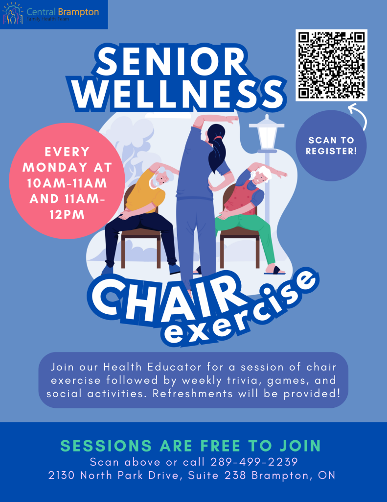 Central Brampton Family Health Team is proud to offer a Senior Chair Exercise Program and Social Hour at our North Park location!