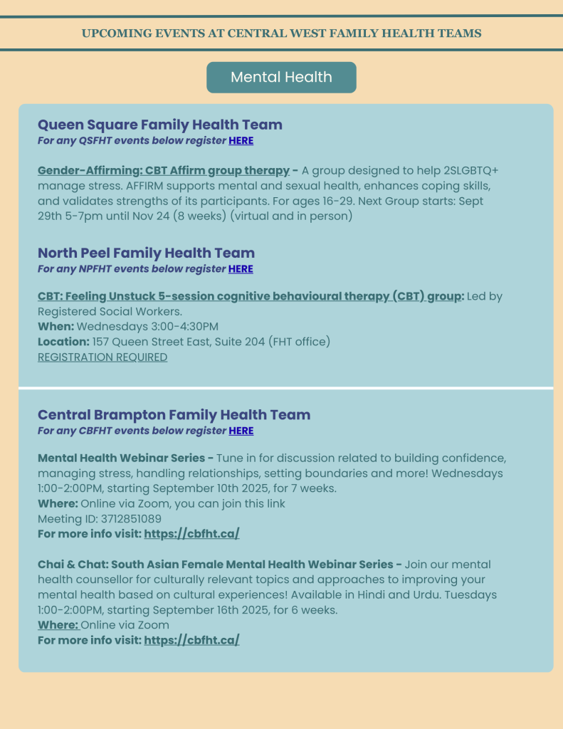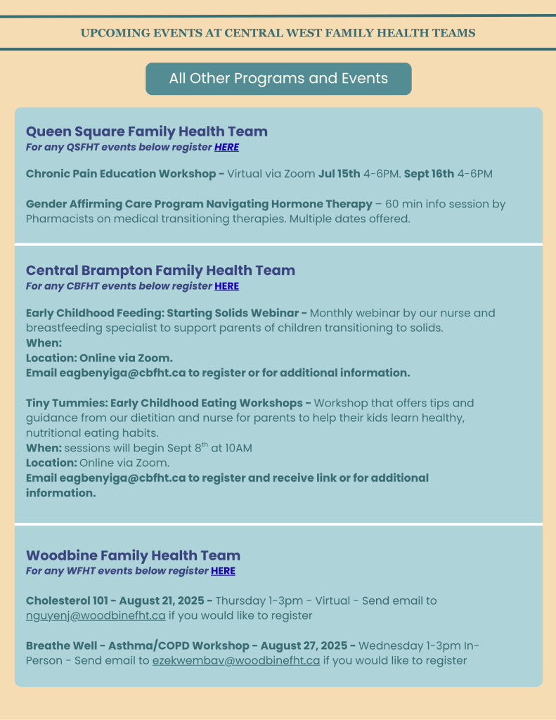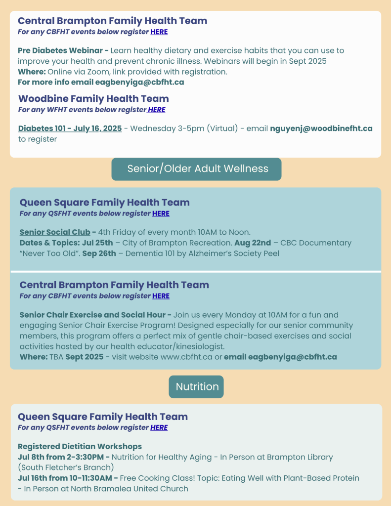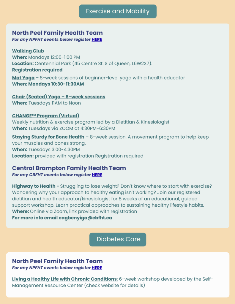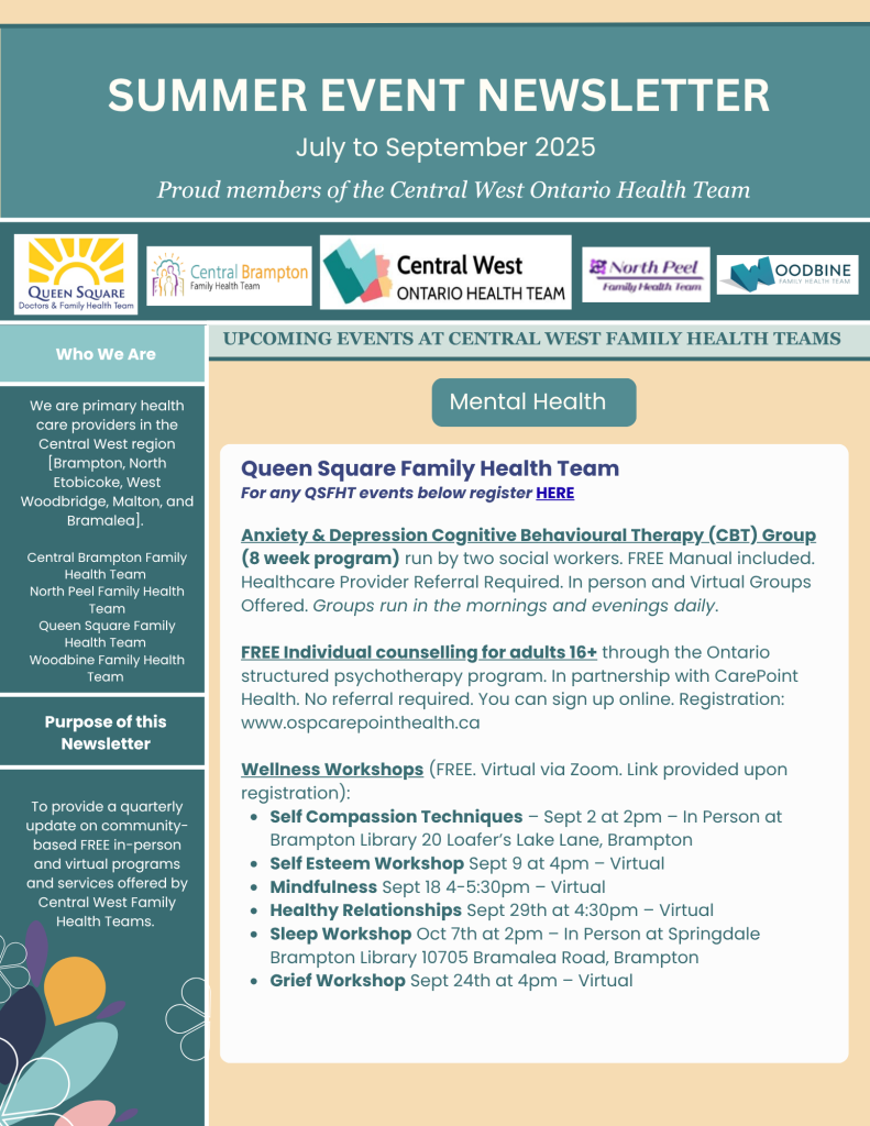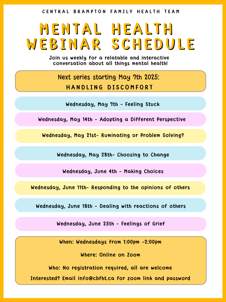 The staff and practitioners at Central Brampton Family Health Team are dedicated to working with you on your journey to sustained good health. We are excited to provide the following educational workshops and events. You do not need to be a patient to register. Anyone in the community can participate!