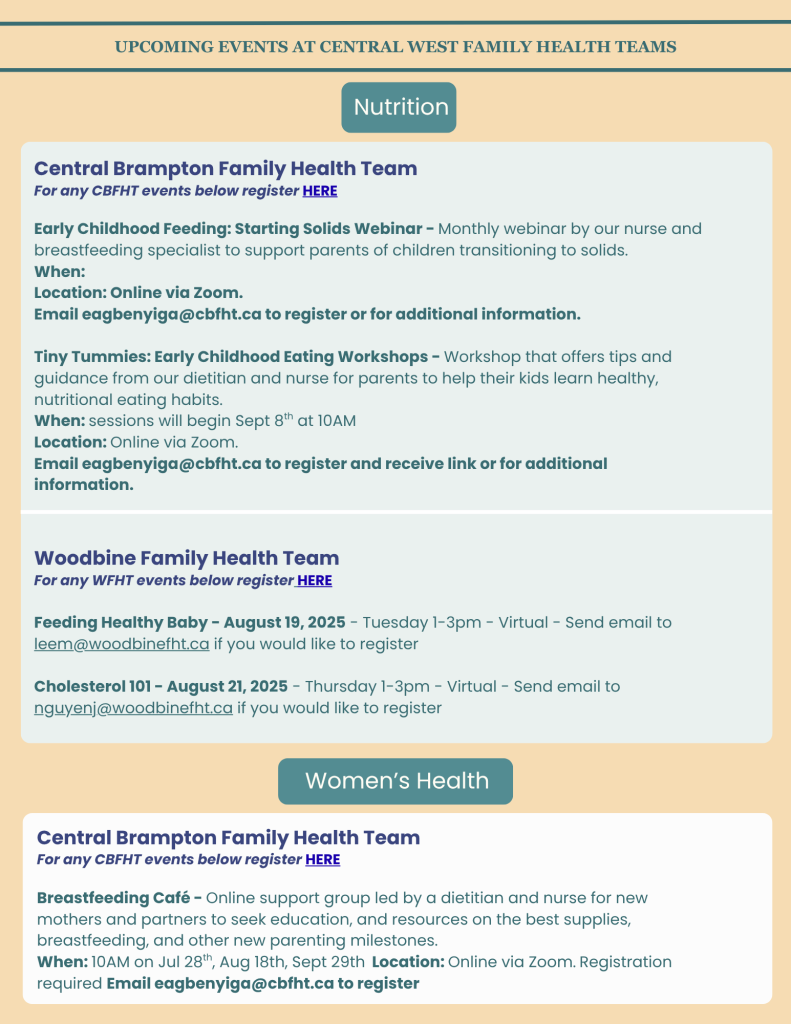 This is a FREE program offered to patients and community members. Join our Registered Dietitian and Lactation Expert to learn about nutrition and breastfeeding for baby and mother. Support-group style educational sessions are offered once a month via Zoom  (every second Wednesday at 10 am). Check out our calendar of events page to learn more or call 289-499-2239 to register at the following link: https://forms.gle/gq2PWJo6Lnu1yFwS7