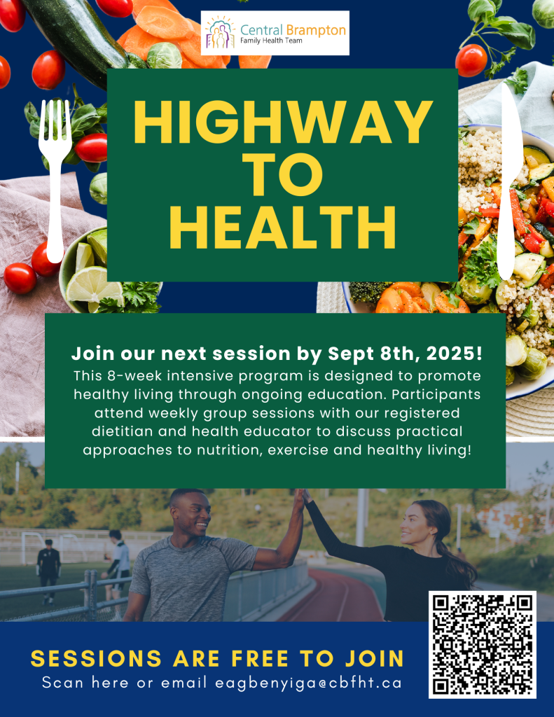 The Health & Lifestyle Education Program at Central Brampton Family Health Team (CBFHT) aims to promote overall wellness and empower patients to adopt healthy lifestyle choices. Through comprehensive education, personalized guidance, and access to specialized healthcare professionals, the program supports individuals in improving their health outcomes and quality of life.