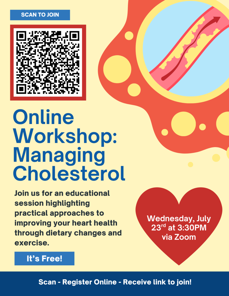 Join us every other month to talk about the steps you can take to lower your cholesterol levels. This webinar is led by our Registered Dietitian and our Certified Diabetes Educator/Registered Kinesiologist